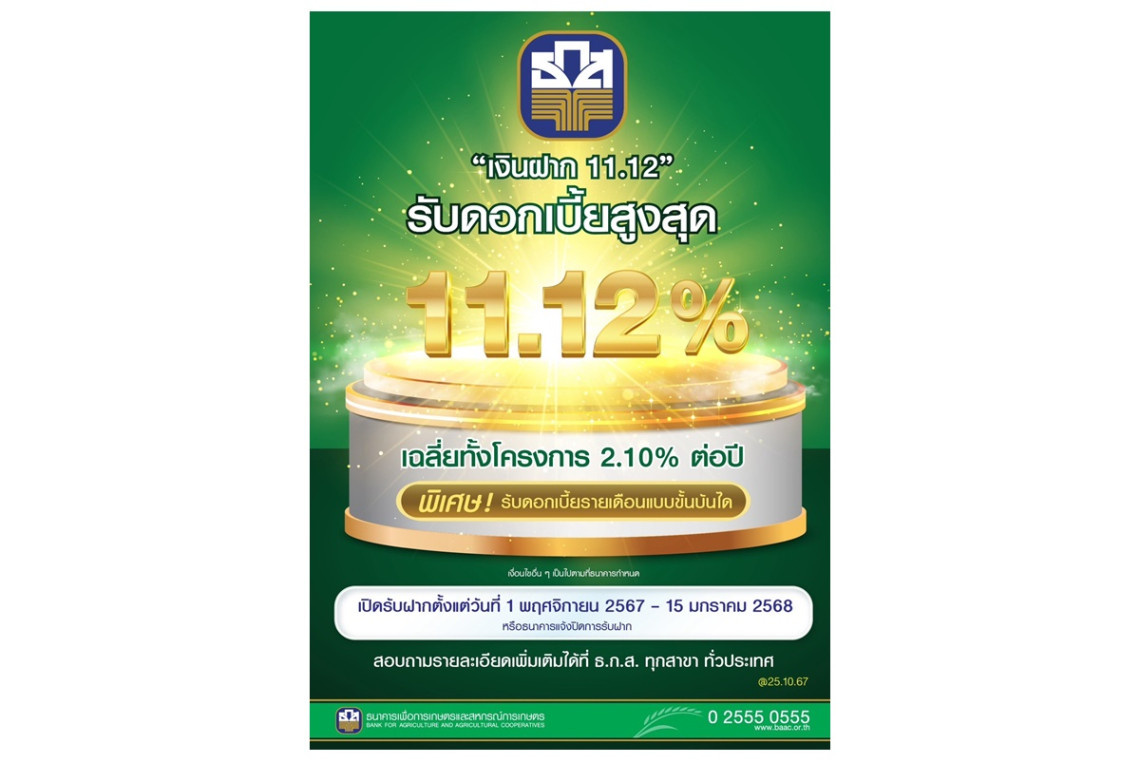 เมื่อวันที่ 30 ตุลาคม 2567 นายฉัตรชัย ศิริไล ผู้จัดการธนาคารเพื่อการเกษตรและสหกรณ์การเกษตร (ธ.ก.ส.) เปิดเผยว่า หลังจากที่ ธ.ก.ส. เปิดให้ลูกค้าจองสิทธิ์ “เงินฝากเขียวชอุ่ม” ซึ่งจัดทำขึ้นในโอกาสครบรอบวันสถาปนา ธ.ก.ส. ปีที่ 59 ตั้งแต่วันที่ 25 ตุลาคมที่ผ่านมา ล่าสุดมีผู้ประสงค์จองสิทธิ์ฝากเงินเต็มวงเงินรับฝากแล้ว และเพื่อเป็นการส่งเสริมการออมให้กับประชาชนอย่างต่อเนื่อง ธ.ก.ส. จึงได้จัดทำผลิตภัณฑ์ใหม่ที่ผลตอบแทนที่สูงขึ้นแก่ผู้รักการออมด้วย “เงินฝาก 11.12" ให้ดอกเบี้ยแบบขั้นบันไดสูงสุดร้อยละ 11.12 ต่อปี เพียงฝากเป็นระยะเวลา 11 เดือน 12 วันแบ่งอัตราดอกเบี้ยเป็น 3 ช่วง ประกอบด้วยช่วงที่ 1 ตั้งแต่วันที่ 1 พฤศจิกายน 2567 -15 สิงหาคม 2568 อัตราดอกเบี้ยร้อยละ 1.30 ต่อปี (ระยะเวลา 9 เดือน 15 วัน) ช่วงที่ 2 ตั้งแต่วันที่ 16 สิงหาคม – 15 กันยายน 2568 อัตราดอกเบี้ยร้อยละ 1.68 ต่อปี (ระยะเวลา1 เดือน) และช่วงที่ 3 ตั้งแต่วันที่ 16 กันยายน - 12 ตุลาคม 2568 รับอัตราดอกเบี้ยสูงสุดถึงร้อยละ 11.12 ต่อปี (ระยะเวลา 27 วัน ) คิดเป็นดอกเบี้ยเฉลี่ยทั้งโครงการร้อยละ 2.10 ต่อปี ฝากขั้นต่ำครั้งละ 50,000 บาท ไม่จำกัดเงินสูงสุดต่อบัญชี สำหรับบุคคลธรรมดาไม่เสียภาษีดอกเบี้ยเงินฝากอีกด้วย