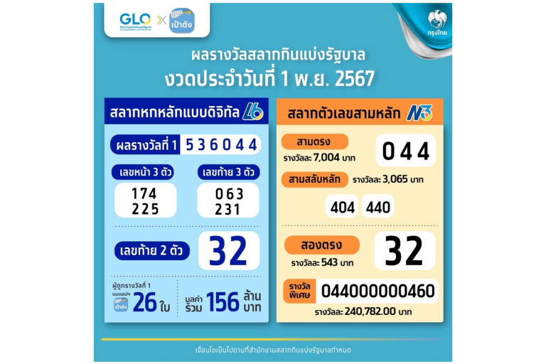 มีคนถูกรางวัลที่ 1 รวม 26 ใบ 156 ล้านบาท