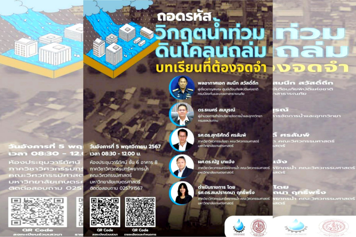 ภาควิชาวิศวกรรมทรัพยากรน้ำ คณะวิศวกรรมศาสตร์ มหาวิทยาลัยเกษตรศาสตร์ ในฐานะของสถาบันการศึกษาที่มีการเรียนการสอนและการวิจัยด้านทรัพยากรน้ำมาอย่างยาวนาน จึงได้จัดเสวนาเรื่อง "ถอดรหัสวิกฤตน้ำท่วมดินโคลนถล่ม: บทเรียนที่ต้องจดจำ" ในวันที่ 5 พฤศจิกายน 2567 เวลา 9.00 –12.00 น. ณ ห้องประชุมวารีทัศน์ ชั้น 6 อาคาร 8 ภาควิชาวิศวกรรมทรัพยากรน้ำ คณะวิศวกรรมศาสตร์ มหาวิทยาลัย เกษตรศาสตร์ ทั้งนี้เพื่อให้สังคมเกิดความเข้าใจร่วมกัน และถอดบทเรียนจากเหตุการณ์ที่ผ่านมาโดยการแลกเปลี่ยนข้อมูลและมุมมองระหว่างนักวิชาการ หน่วยงานด้านน้ำ และผู้สนใจ เพื่อนำไปสู่การวิเคราะห์ปัญหาอย่างรอบด้าน ทั้งในแง่ของข้อมูลน้ำ สาเหตุของภัยพิบัติ ผลกระทบที่เกิดขึ้น และ วิธีการจัดการที่มีประสิทธิภาพในอนาคต อีกทั้งยังเป็นการวางแนวทางการปรับตัวเพื่อรับมือกับภัยพิบัติที่อาจเกิดขึ้นใหม่ในอนาคต ภายใต้สภาพแวดล้อมที่มีการเปลี่ยนแปลงอย่างต่อเนื่อง โดยคณะผู้จัดงานเสวนาคาดหวังว่าการเสวนาในครั้งนี้จะเป็นเวทีที่สำคัญในการพัฒนาการทำงานร่วมกันระหว่างภาคส่วนต่าง ๆ และ สร้างความเข้าใจในการจัดการภัยพิบัติอย่างยั่งยืน