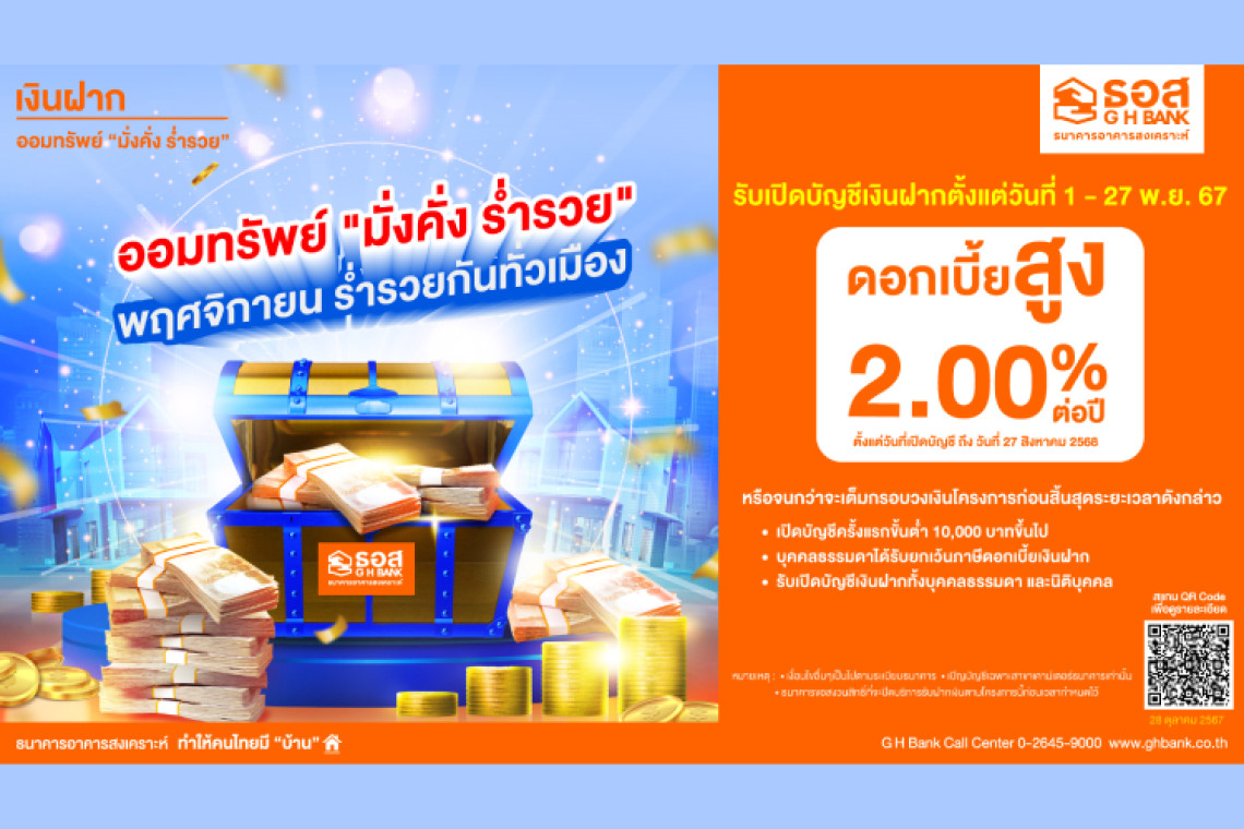 ออมเลยไม่ต้องรอ!! ธอส. ชวนเปิดบัญชีเงินฝากออมทรัพย์ “มั่งคั่ง ร่ำรวย” ตั้งแต่วันที่ 1 – 27 พฤศจิกายน 2567 รับดอกเบี้ยสูงถึง 2.00% ต่อปี