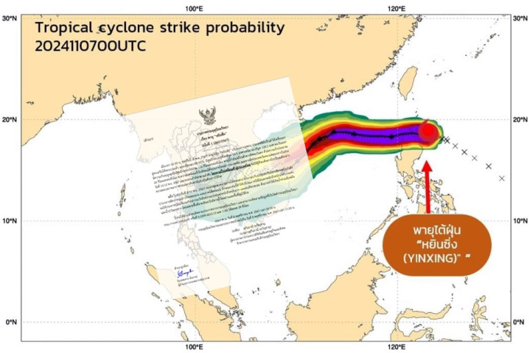 เมื่อเวลา 01.00 น. ของวันนี้ (8 พ.ย. 2567) พายุไต้ฝุ่น “หยินซิ่ง” บริเวณเกาะลูซอน ประเทศฟิลิปปินส์ ได้เคลื่อนลงสู่ทะเลจีนใต้ตอนบนแล้ว และเมื่อเวลา 04.00 น. มีศูนย์กลางอยู่ที่ละติจูด 18.5 องศาเหนือ ลองจิจูด 120.1 องศาตะวันออกมีความเร็วลมสูงสุดใกล้ศูนย์กลางประมาณ 150 กิโลเมตรต่อชั่วโมง พายุนี้กำลังเคลื่อนตัวทางทิศตะวันตก ด้วยความเร็วประมาณ20 กิโลเมตรต่อชั่วโมง คาดว่าจะเคลื่อนเข้าใกล้ตอนใต้ของเกาะไหหลำ ประเทศจีน และชายฝั่งประเทศเวียดนามตอนกลางในช่วงวันที่ 10-12 พ.ย. 2567 และจะอ่อนกำลังลงตามลำดับ โดยพายุนี้ไม่เคลื่อนเข้าสู่ประเทศไทย ขอให้ผู้ที่จะเดินทางไปบริเวณดังกล่าวตรวจสอบสภาพอากาศก่อนออกเดินทางในช่วงวันดังกล่าวไว้ด้วย