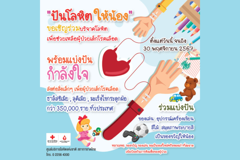 ศูนย์บริการโลหิตแห่งชาติ สภากาชาดไทย ชวนเหล่าฮีโร่ ร่วมแบ่งปันความสุข เติมเต็มโลหิตช่วยผู้ป่วยเด็กโรคเลือด ในโครงการ “ปันโลหิต ให้น้อง”ตลอดเดือนพฤศจิกายน 2567 ณ ศูนย์บริการโลหิตแห่งชาติ และภาคบริการโลหิตแห่งชาติ 12 แห่งทั่วประเทศ พร้อมชวนแบ่งปันของเล่น และสิ่งของเครื่องใช้จำเป็นสำหรับน้องๆ ได้ที่ ศูนย์บริการโลหิตแห่งชาติ ถนนอังรีดูนังต์ ตั้งแต่วันนี้ - 30 พฤศจิกายน 2567