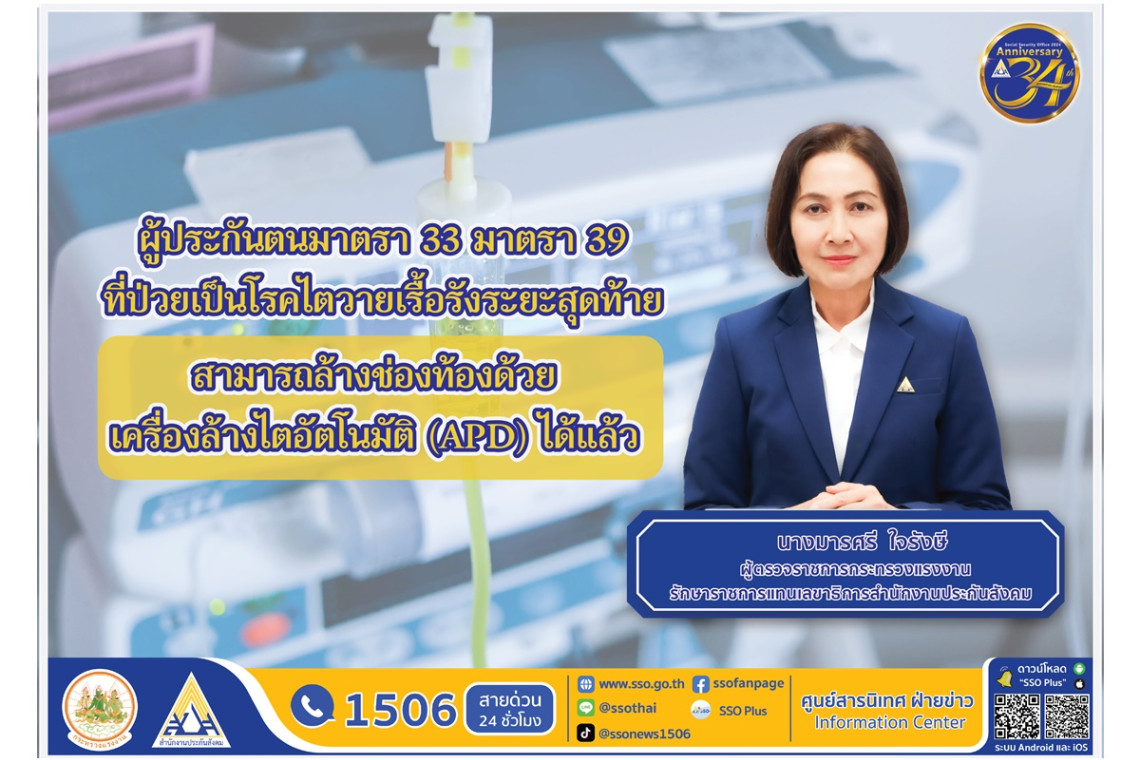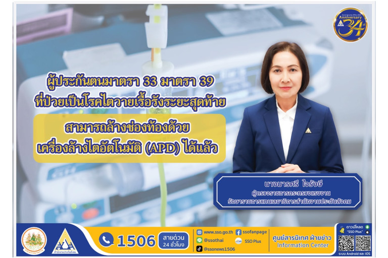 รู้ยัง! ประกันสังคม ให้สิทธิประโยชน์ผู้ประกันตนป่วยโรคไตวายเรื้อรังระยะสุดท้าย สามารถล้างไตทางช่องท้องด้วยเครื่องล้างไตอัตโนมัติ (APD) ได้แล้ว