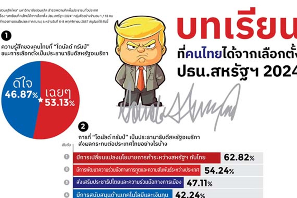 2.การที่ "โดนัลด์ ทรัมป์" เป็นประธานาธิบดีสหรัฐอเมริกา ส่งผลกระทบต่อประเทศไทยอย่างไรบ้าง อันดับ 1 มีการเปลี่ยนแปลงนโยบายการค้าระหว่างสหรัฐฯ กับไทย 62.82% อันดับ 2 มีการพัฒนาความร่วมมือทางการทูตและความสัมพันธ์ระหว่างประเทศ 54.24% อันดับ 3 ส่งเสริมประชาธิปไตยและความร่วมมือทางการเมือง 47.11% อันดับ 4 มีการสนับสนุนด้านเทคโนโลยีและเงินทุน 42.24% อันดับ 5 การท่องเที่ยวและข้อจำกัดด้านวีซ่าที่อาจเพิ่มขึ้น 39.53%