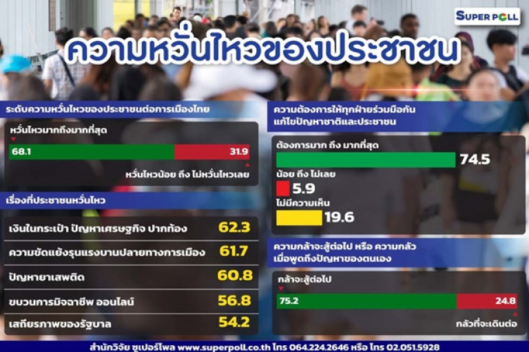 เมื่อวันที่ 10 พฤศจิกายน 2567 สำนักวิจัย “ซูเปอร์โพล” เสนอผลสำรวจเรื่อง “ความหวั่นไหวของประชาชน” กรณีศึกษาตัวอย่างประชาชนทุกสาขาอาชีพทั่วประเทศ ดำเนินโครงการทั้งการวิจัยเชิงปริมาณ (Quantitative Research) และการวิจัยเชิงคุณภาพ (Qualitative Research) รวมจำนวนตัวอย่างในการวิเคราะห์ทางสถิติทั้งสิ้น จำนวนทั้งสิ้น 1,032 ตัวอย่าง ดำเนินโครงการระหว่างวันที่ 5 - 9 พฤศจิกายน 2567 ที่ผ่านมา