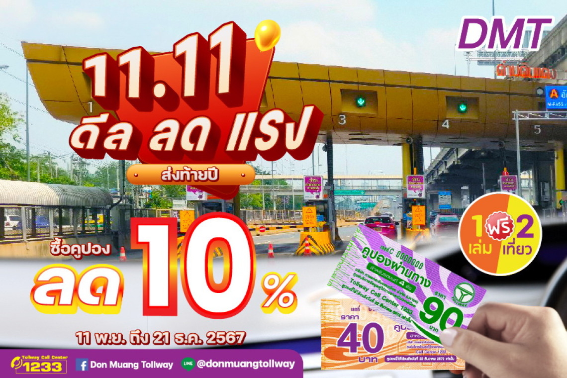 เมื่อวันที่ 11 พ.ย.67 บริษัท ทางยกระดับดอนเมือง จำกัด (มหาชน) หรือ DMT จัดโปร 11.11 ส่วนลดพิเศษ ต้อนรับเทศกาลปลายปี มอบส่วนลดสูงสุดถึง 10% เมื่อซื้อคูปองผ่านทางอัตราใหม่ เพื่อให้ผู้ใช้บริการได้รับความคุ้มค่าในช่วงเวลาแห่งการเฉลิมฉลอง โปรโมชั่นนี้เริ่มจำหน่ายตั้งแต่วันที่ 11 พฤศจิกายน-21 ธันวาคม 2567 สามารถซื้อคูปองได้ 3 แห่ง ได้แก่ สำนักงานใหญ่บมจ.ทางยกระดับดอนเมือง ,จุดจำหน่ายคูปอง ศูนย์การค้าฟิวเจอร์พาร์ครังสิต ชั้น 2 หน้า AIS Shop และศูนย์ราชการแจ้งวัฒนะ อาคาร B ชั้น1 หน้า Tops โดยคูปองส่วนลดดังกล่าวจะสามารถใช้ได้ตั้งแต่วันที่ 22 ธันวาคมนี้เป็นต้นไป นับเป็นโอกาสดีสำหรับผู้ที่เดินทางบ่อย และเป็นของขวัญส่งท้ายปีให้กับผู้ใช้บริการ ถือเป็นเมกะเซล (Mega Sale) มอบที่สุดแห่งความคุ้มค่าให้แก่ผู้ใช้ทางยกระดับโทล์ลเวย์