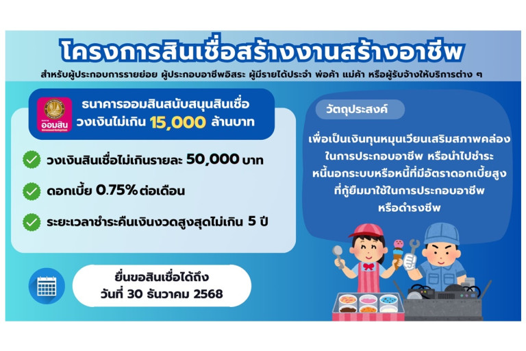 โดยโครงการสินเชื่อสร้างงานสร้างอาชีพ โดยธนาคารออมสินสนับสนุนสินเชื่อให้แก่ผู้ประกอบการรายย่อย ผู้ประกอบอาชีพอิสระ ผู้มีรายได้ประจำ ลูกจ้าง พ่อค้า แม่ค้า หรือผู้รับจ้างให้บริการต่าง ๆ เพื่อเป็นเงินทุนหมุนเวียนเสริมสภาพคล่องในการประกอบอาชีพ หรือนำไปชำระหนี้นอกระบบ หรือหนี้ที่มีอัตราดอกเบี้ยสูงที่กู้ยืมมาใช้ในการประกอบอาชีพหรือดำรงชีพ วงเงินรวมไม่เกิน 15,000 ล้านบาท วงเงินสินเชื่อต่อรายไม่เกินรายละ 50,000 บาท อัตราดอกเบี้ยคงที่ร้อยละ 0.75 ต่อเดือน ระยะเวลาชำระคืนเงินงวดสูงสุดไม่เกิน 5 ปี สามารถยื่นขอสินเชื่อได้ถึงวันที่ 30 ธันวาคม 2568