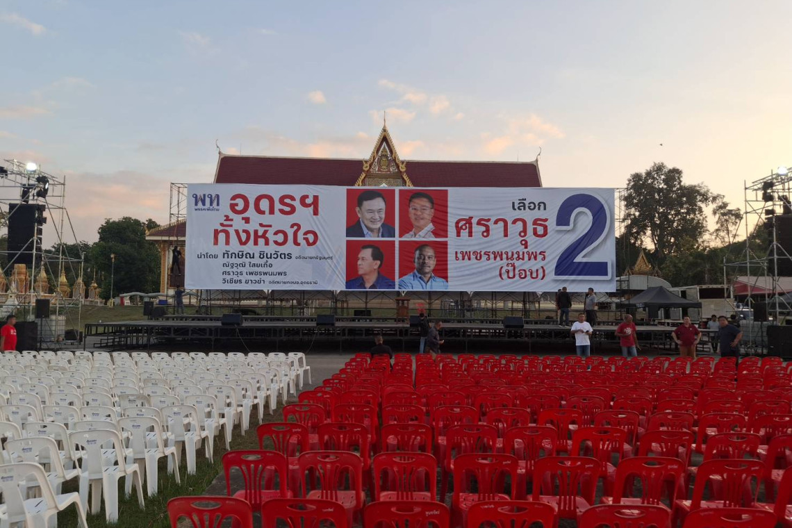 ส่วนบรรยากาศที่บริเวณวัดศรีนคราราม วันนี้ นายธีระชัย แสนแก้ว ส.ส.พรรคเพื่อไทย เขต7 ได้เดินทางมาเตรียมความพร้อม โดยจัดเวทีใหญ่กว่าหมอลำ เตรียมให้อดีตนายกทักษิณขึ้นเวทีพบปะกับพี่น้องประชาชนเพื่อช่วยนายศราวุธ เพชรพนมพร ผู้สมัครชิงนายกอบจ.อุดรธานี พร้อมกับเตรียมเก้าอี้สีแดงประมาณ 10,000 ตัวไว้รองรับประชาชนที่จะเดินทางมาในวันพรุ่งนี้หากไม่พอจะนำเก้าอี้สีขาวมาเพิ่ม
