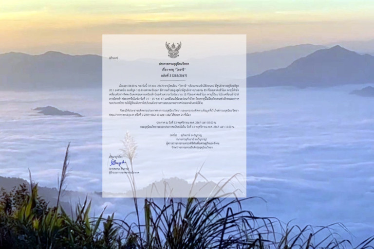 วันที่ 13 พ.ย.67 กรมอุตุนิยมวิทยา ประกาศฉบับที่ 2 เรื่อง พายุ “โทราจี” ความว่า...