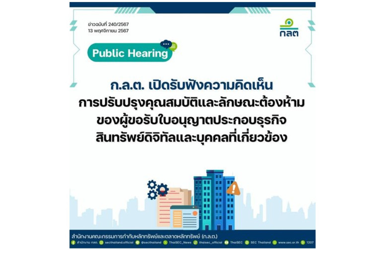 ก.ล.ต. จึงเปิดรับฟังความคิดเห็นต่อหลักการปรับปรุงคุณสมบัติและลักษณะต้องห้ามของผู้ขอรับใบอนุญาตประกอบธุรกิจสินทรัพย์ดิจิทัลและบุคคลที่เกี่ยวข้อง โดยได้เผยแพร่เอกสารรับฟังความคิดเห็นในเรื่องดังกล่าวบนเว็บไซต์ ก.ล.ต. https://www.sec.or.th/TH/Pages/PB_Detail.aspx?SECID=1028 และระบบกลางทางกฎหมาย http://law.go.th/listeningDetail?survey_id=NDYxOERHQV9MQVdfRlJPTlRFTkQ= ผู้ที่เกี่ยวข้องและผู้สนใจสามารถแสดงความคิดเห็นได้ที่เว็บไซต์ หรือทาง e-mail: jirapat@sec.or.th หรือ thanapatk@sec.or.th จนถึงวันที่ 27 พฤศจิกายน 2567