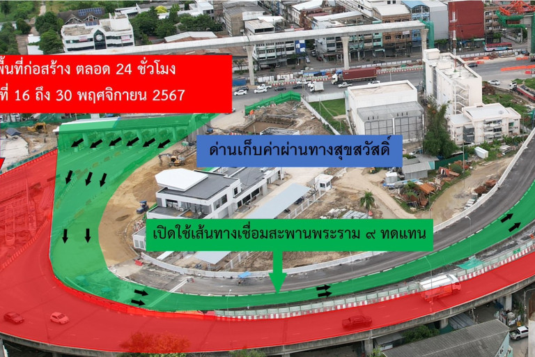 การทางพิเศษแห่งประเทศไทย (กทพ.) กระทรวงคมนาคมได้ว่าจ้าง กิจการร่วมค้า ไอทีดี-วีซีบี (ITD-VCB Joint Venture) ประกอบด้วย บริษัท อิตาเลียนไทย ดีเวล๊อปเมนต์ จำกัด (มหาชน) และบริษัท วิจิตรภัณฑ์ก่อสร้าง จำกัด เป็นผู้รับจ้างดําเนินการก่อสร้าง โครงการทางพิเศษสายพระราม3 - ดาวคะนอง - วงแหวนรอบนอกกรุงเทพมหานครด้านตะวันตกสัญญาที่ 3 แจ้งการปิดจราจรชั่วคราวบนทางพิเศษเฉลิมมหานคร บริเวณด่านฯ สุขสวัสดิ์ ฝั่งขาเข้ากรุงเทพฯ ด้านขวาทางจำนวน 4 ช่องจราจร ตั้งแต่วันที่ 16-30 พฤศจิกายน 2567 ตลอด 24 ชั่วโมง และเปิดใช้งานทางเชื่อมสะพานพระราม 9 ทดแทน