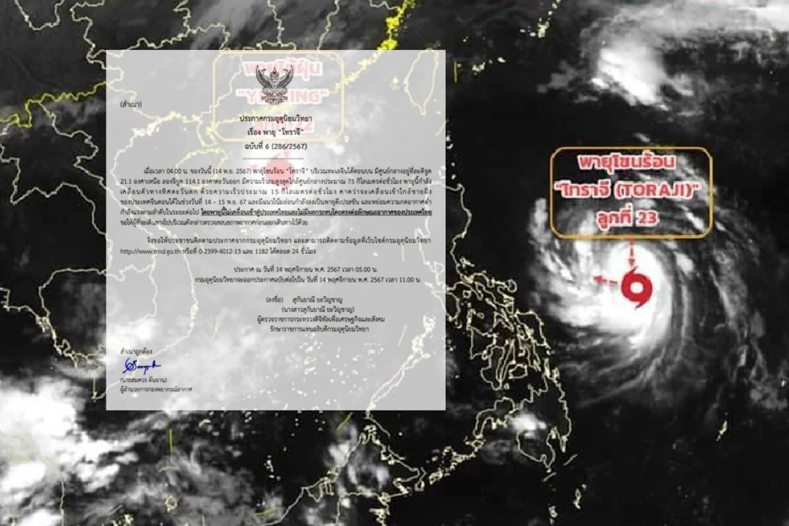 วันที่ 14 พ.ย.67 กรมอุตุนิยมวิทยา ประกาศฉบับที่ 6 เรื่อง พายุ “โทราจี” ความว่า...