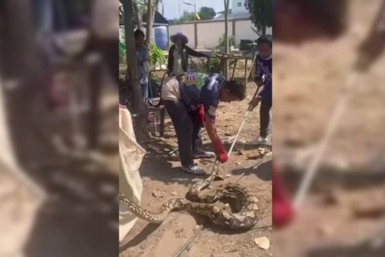 เจ้าหน้าที่กู้ภัยพระชนก ใช้เวลา 20นาที นำงูเหลือขนาดใหญ่ใสถุงปุ๋ย ที่เตรียมมาด้วยความทุลักทุเล เนื่องจากงูลำตัวใหญ่ พร้อมกับนำไปปล่อยสู่ธรรมชาติต่อไป โดยมีชาวบ้านลุ้นด้วยความระทึก พร้อมกับขอเลขที่บ้านไปเสี่ยงดวง