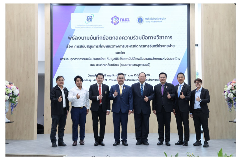 เมื่อวันที่ 14 พฤศจิกายน 2567 ที่สำนักงานใหญ่ การนิคมอุตสาหกรรมแห่งประเทศไทย (กนอ.) ได้มีพิธีลงนามบันทึกข้อตกลงความร่วมมือ (MOU) ทางวิชาการ เรื่อง การสนับสนุนการศึกษาแนวทางการบริหารจัดการสารอินทรีย์ระเหยง่าย (VOCs) ระหว่าง กนอ.ร่วมกับ มูลนิธิเพื่อสถาบันปิโตรเลียมและพลังงานแห่งประเทศไทย และ มหาวิทยาลัยมหิดล (คณะสาธารณสุขศาสตร์) โดยมี นายคณพศ ขุนทอง รองผู้ว่าการ กนอ. (ฝ่ายปฏิบัติการ 3) ดูแลพื้นที่ท่าเรืออุตสาหกรรมมาบตาพุด, นายคุรุจิต นาครทรรพ ผู้อำนวยการสถาบันปิโตรเลียมและพลังงานแห่งประเทศไทย (สถาบันปิโตรเลียมฯ) และศาสตราจารย์ นายแพทย์ปิยะมิตร ศรีธรา อธิการบดีมหาวิทยาลัยมหิดล ร่วมลงนาม