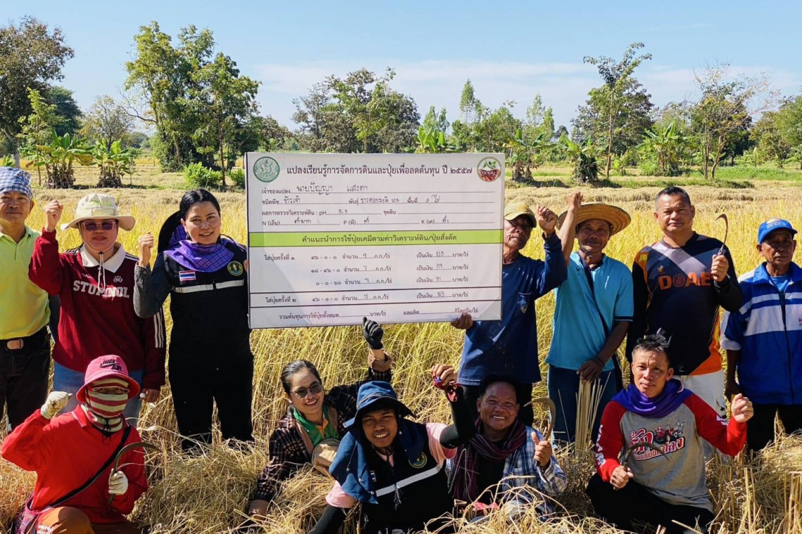 เกษตรอำเภอเลิงนกทา นำเจ้าหน้าที่เกี่ยวข้าวและฟาด(ตี) ที่แปลงเรียนรู้การจัดการดินเพื่อลดต้นทุนการผลิตปี 67