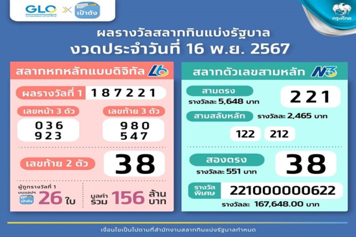 สลากดิจิทัล บนแอปฯเป๋าตัง ของธนาคารกรุงไทย งวดวันที่ 16 พ.ย. 67 เลขสลากรางวัลที่ 1: 187221มีคนถูกรางวัลที่ 1 รวม 26 ใบ 156 ล้านบาท