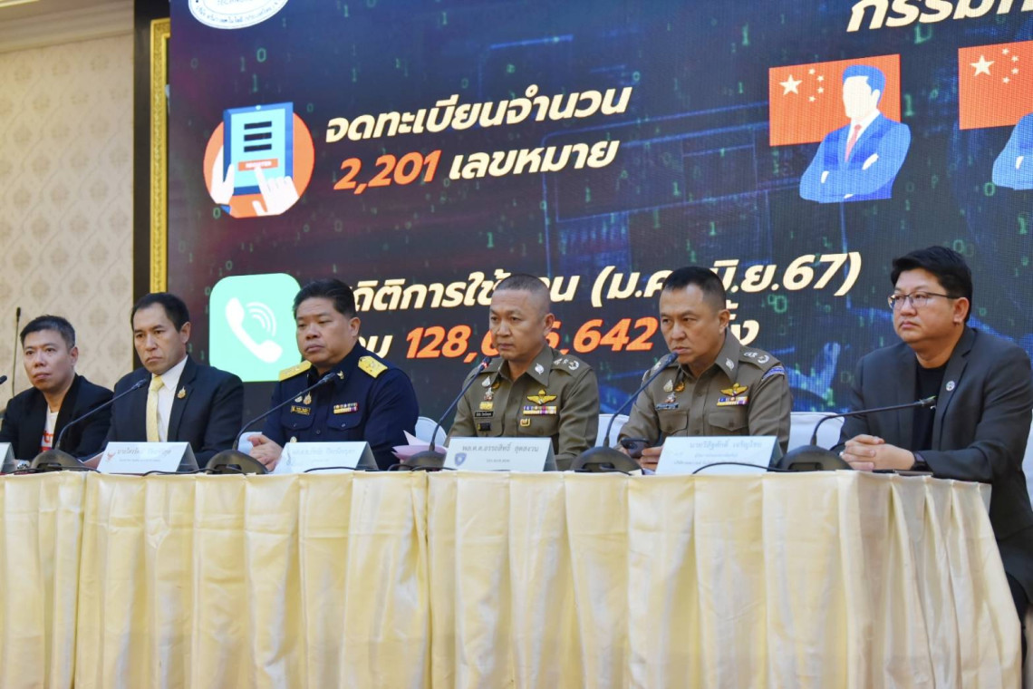 วันที่ 18 พฤศจิกายน 2567 ที่สำนักงานตำรวจแห่งชาติ พล.ต.ท.ธัชชัย ปิตะนีละบุตร ผู้ช่วยผู้บัญชาการตำรวจแห่งชาติ ในฐานะรองผู้อำนวยการ ศูนย์ปราบปรามอาชญากรรมทางเทคโนโลยีสารสนเทศ สำนักงานตำรวจแห่งชาติ (ผู้ช่วย ผบ.ตร./รอง ผอ.ศปอส.ตร.) แถลงผลการปฏิบัติการ “มาตรการระเบิดสะพานโจร” 2 ปฏิบัติการ จับแก๊งค์จีนเทาเช่าเบอร์โทร 02-xxxxxxx กว่าหมื่นเลขหมาย โทรหลอกประชาชนมากกว่า 700 ล้านครั้ง และใช้เครื่องส่ง SMS ปลอม (False Base Station) ส่งข้อความถึงประชาชนภายใน 3 วัน เกือบล้านครั้ง โดยมี พล.ต.ต.อรรถสิทธิ์ สุดสงวน รอง ผบช.สอท. , มล.ภู่ทอง ทองใหญ่ รองอธิบดีกรมพัฒนาธุรกิจการค้า , นายไตรรัตน์ วิริยะศิริกุล รักษาการแทนเลขาธิการ กสทช. , ณวิสิฐศักดิ์ เจริญไชย ผู้จัดการฝ่ายองค์กรสัมพันธ์ บริษัท แอดวานซ์ อินโฟร์ เซอร์วิส จำกัด (มหาชน) ร่วมแถลง ณ ห้องสารสิน ชั้น 2 อาคาร 1 สำนักงานตำรวจแห่งชาติ