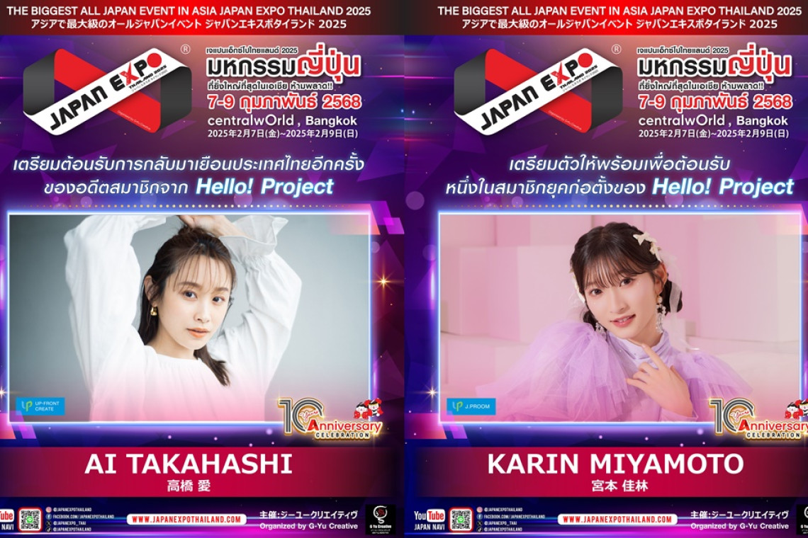 JAPAN EXPO THAILAND 10 ปี ทั้งที พบกับศิลปินจากค่าย Hello! Project กลับมาร่วมงานอีกครั้ง อดีตสมาชิกจาก Hello! Project "AI TAKAHASHI (ไอ ทาคาฮาชิ)" และ ครั้งแรก! ของหนึ่งในสมาชิกยุคก่อตั้ง Hello! Project "KARIN MIYAMOTO (คาริน มิยาโมโตะ)" ที่จะมาสร้างสีสันในงาน JAPAN EXPO THAILAND 2025 ร่วมเฉลิมฉลองครบรอบ 10 ปี เตรียมตัวมาพบกับความน่ารักของทั้ง 2 ศิลปิน อย่างใกล้ชิดที่จะมามอบความสดใสให้ทุกคนภายในงาน และกิจกรรมสุดพิเศษ Exclusive Fan Meeting ติดตามรายละเอียดได้เร็ว ๆ นี้!
