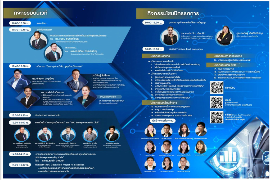 นิทรรศการ Suan Dusit Innovation และมุมเจรจาธุรกิจ การเสวนาในหัวข้อ "ติดอาวุธงานวิจัย...สู่ธุรกิจนวัตกรรม" การเปิดตัว "กองทุนนวัตกรรม" และ "SDU Entrepreneurship Club" กิจกรรม Show Case: From Project to Incubation เช่น นวัตกรรมอาหาร นวัตกรรมเครื่องสำอาง นวัตกรรมทางการเกษตร และนวัตกรรมอื่นๆ ทั้งนี้บุคคลท่านใดสนใจเข้าร่วมงาน สามารถลงทะเบียนเข้าร่วมงานได้ตั้งแต่วันนี้ - 15 พ.ย. 67 ผ่าน https://forms.gle/aM8jjG352gYbLNt78 และผู้ประกอบการที่สนใจผลงานนวัตกรรมของมหาวิทยาลัยสวนดุสิต สามารถศึกษารายละเอียดเพิ่มเติมได้ที่ https://ebooks.dusit.ac.th/detail.php?recid=4139