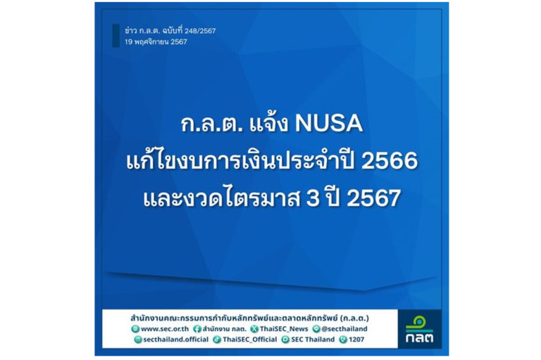 "ก.ล.ต." แจ้ง NUSA แก้ไขงบปี 66-Q3/67 รายการที่อดีตผู้บริหารถูกกล่าวโทษทุจริตภายใน 19 ธ.ค.67