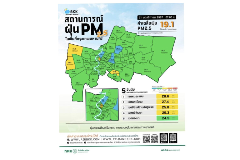 เมื่อวันที่ 21 พฤศจิกายน พ.ศ.2567 ศูนย์ข้อมูลคุณภาพอากาศกรุงเทพมหานครรายงานสถานการณ์ฝุ่น PM 2.5 ดังนี้