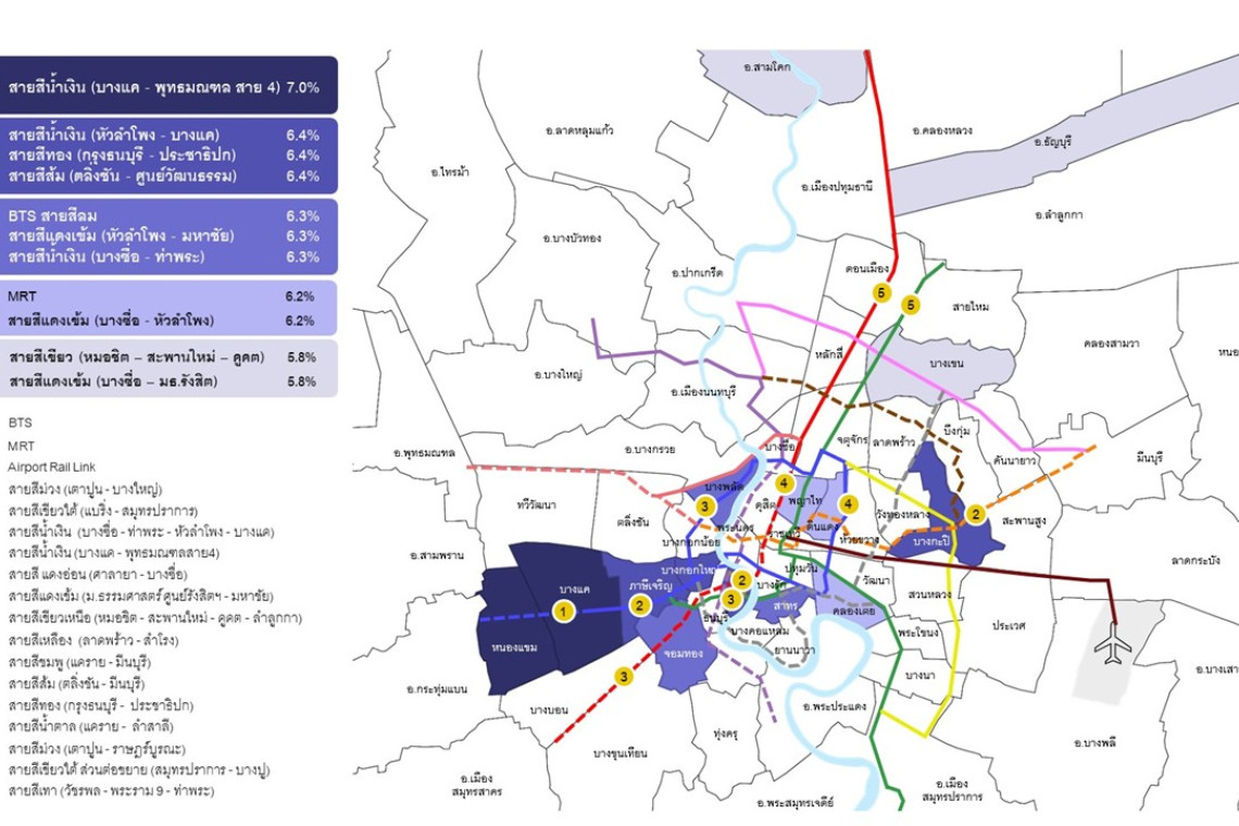 3) รถไฟฟ้าสายสีลม มีค่าดัชนีเท่ากับ 503.6, รถไฟฟ้า สายสีน้ำเงิน (บางซื่อ-ท่าพระ) มีค่าดัชนีเท่ากับ 495.9 และรถไฟฟ้า สายสีแดงเข้ม (หัวลำโพง-มหาชัย) มีค่าดัชนีเท่ากับ 501.4 มีอัตราเพิ่มขึ้นของราคาที่ดินร้อยละ 6.3 เท่ากันทั้ง 3 สาย เมื่อเทียบกับช่วงเดียวกันของปีก่อน (YoY) โดยราคาที่ดินที่ปรับเพิ่มขึ้นอยู่ในเขตภาษีเจริญ, สาทร และบางกอกใหญ่