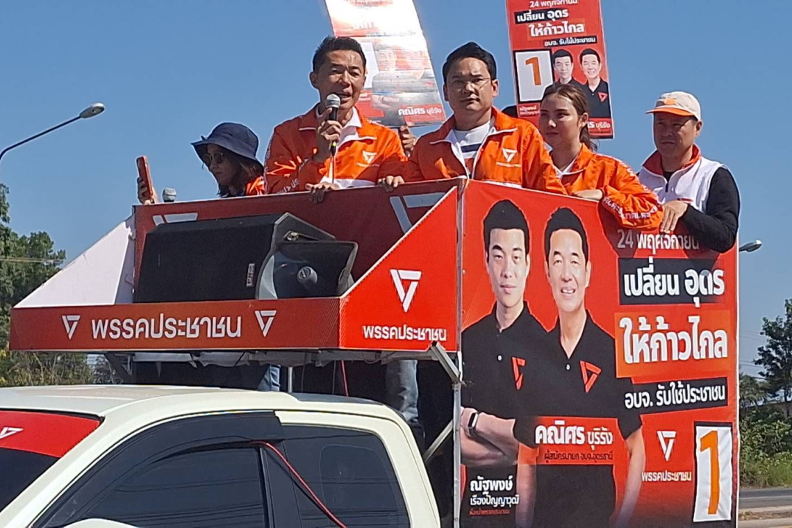 วันที่ 22 พ.ย.67 ผู้สื่อข่าวรายงาน ว่า ศึกเลือกตั้งนายกอบจ.อุดรธานีสุดคึกคักในช่วงโค้งสุดท้ายหรือเพียง 2 วันก็จะถึงวันไปใช้สิทธิเลือกตั้ง นายกอบจ.อุดรธานี ในวันอาทิตย์ที่ 24 พ.ย.67 ปรากฏว่า วันนี้พรรคประชาชนขนขุนพลลงพื้นที่จ.อุดรธานี หาเสียงช่วยนายคณิศร ขุริรังค์ ผู้สมัครหมายเลข 1 กันอย่างพร้อมหน้า พร้อมกับขึ้นรถแห่ช่วยหาเสียงไปทุกอำเภอทั่วจังหวัดอุดรธานี โดยแบ่งเป็นสายๆ 6 สายด้วย แต่ละสายก็มีชื่อการเดินขึ้นรถแห่หาเสียง ที่เก๋ไก๋แปลกตา อย่างสายแรก แกนนำขึ้นรถแห่หาเสียงช่วยนายคณิศร ชื่อสายนายฮ้อยทมิฬ ขึ้นรถแห่หาเสียงในพื้นที่อ.โนนสะอาด,หนองแสง และอ.หนองวัวซอ มีแกนนำคนสำคัญเช่น นายพริษฐ์ วัชรสินธุ, ภคมน หนุนอนันต์, อภิชาติ ศิริสุนทร และ อรรถพล บัวพัฒน์ สายที่ 2 ชื่อสายอุสาบารส นำโดย พนิดา มงคลสวัสดิ์, ธนาธร จึงรุ่งเรืองกิจ และ ทวีศักดิ์ ทักษิณ เดินสายขึ้นรถแห่สายอ.กุดจับ น้ำโสม บ้านผือ และนายูง สายที่ 3 ผาแดงนางไอ่ นำโดย คณิศร ขุริรัง, พิธา ลิ้มเจริญรัตน์, ปิยบุตร แสงกนกกุล