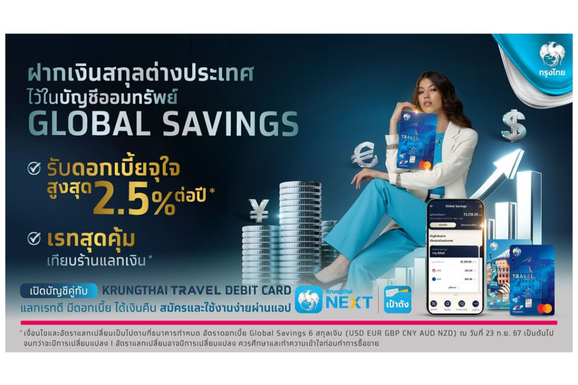 บัญชีออมทรัพย์สกุลเงินต่างประเทศ Global Savings ครอบคลุมทุกมิติของการทำธุรกรรมต่างประเทศประกอบไปด้วย การฝาก รองรับ 20 สกุลเงินทั่วโลก ได้แก่ USD, EUR, JPY, GBP, AUD, CHF, CAD, CNY, NZD, SEK, NOK, SGD, HKD, DKK, INR, KRW, TWD, SAR, AED และ QAR ต่อยอดความมั่งคั่ง เมื่อลูกค้าฝากเงิน รับดอกเบี้ย สูงสุด 2.5% ต่อปี ผ่าน 6 สกุลเงินหลัก ได้แก่ ดอลลาร์สหรัฐ USD, ปอนด์อังกฤษ GBP, ดอลลาร์นิวซีแลนด์ NZD, ดอลลาร์ออสเตรเลีย AUD, ยูโร EUR และหยวน CNY โอนสุดคุ้ม ใช้บัญชี Global Savings โอนเงินไปต่างประเทศได้เรทดี ค่าธรรมเนียมถูก ครอบคลุมระบบ SWIFT CODE และ WARP Platform ลงทุนเสริมความมั่งคั่ง เพียงผูกบัญชี Global Savings กับแอปฯ เป๋าตัง เพื่อลงทุนซื้อขายทองคำออนไลน์บน Gold Wallet สะดวก ปลอดภัย ได้เรทดี ช่วยประหยัดต้นทุน ใช้จ่ายที่ต่างประเทศ ผูกบัญชี Global Savings กับบัตร Krungthai Travel Debit Card เพื่อรูดใช้จ่ายที่ต่างประเทศรับเครดิตเงินคืนสูงสุด 5,000 บาทต่อปี สะดวก เรทดี ใช้จ่ายได้ทั้งออนไลน์ และที่ร้านค้า