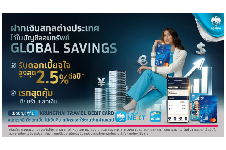 นอกจากนี้ ยังเพิ่มความคุ้มค่าให้กับลูกค้า โดยรับอัตราแลกเปลี่ยนพิเศษเมื่อแลกเงินหรือขายคืน ด้วยระบบแจ้งเตือนเรทดีไม่มีพลาด สามารถแลกเงินสกุลต่างประเทศเก็บไว้ได้เมื่อถึงเรทที่ต้องการ ช่วยประหยัดต้นทุนทางการเงิน สอบถามข้อมูลเพิ่มเติมได้ที่ธนาคารกรุงไทยทุกสาขา ติดต่อ Krungthai Contact Center โทร. 02-111-1111 ศึกษารายละเอียดเพิ่มเติมได้ที่ https://krungthai.com/link/globalsavings