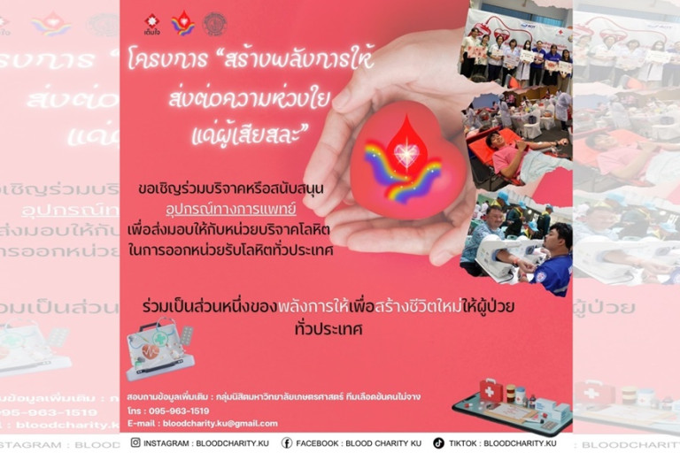 สืบเนื่องจากความต้องการโลหิตในประเทศไทยเพิ่มขึ้นอย่างต่อเนื่องเพื่อรักษาผู้ป่วยในโรงพยาบาลทั่วประเทศ กลุ่มนิสิตมหาวิทยาลัยเกษตรศาสตร์ ทีมเลือดข้นคนไม่จาง ได้จัดโครงการ KU Blood Charity “หนึ่งคนให้ หลายคนได้” ภายใต้โครงการเต็มใจ ปี 2“รวมใจไทย 72 ล้านซีซี เทิดพระเกียรติ 72 พรรษา” ของศูนย์บริการโลหิตแห่งชาติ สภากาชาดไทย ร่วมกับมูลนิธิดั่งพ่อสอน ระหว่างวันที่ 17 กันยายน 2567 ถึงวันที่ 16 ตุลาคม 2567 ที่ผ่านมา และสามารถรวบรวมโลหิตได้มากถึง 1,000,300 ซีซี ซึ่งเป็นผลจากความร่วมมือระหว่างหลายภาคส่วนและการเสียสละของทีมแพทย์ พยาบาล และบุคลากรทางการแพทย์ เพื่อแสดงความขอบคุณและสนับสนุนทีมแพทย์ผู้ปฏิบัติงานที่ทำหน้าที่อย่างไม่รู้จักเหน็ดเหนื่อยด้วยหัวใจแห่งการเสียสละ กลุ่มนิสิตมหาวิทยาลัยเกษตรศาสตร์ ทีมเลือดข้นคนไม่จาง จึงได้จัดโครงการ “สร้างพลังการให้ ส่งต่อความห่วงใยแด่ผู้เสียสละ” ขึ้น เพื่อจัดหาเวชภัณฑ์และสิ่งของจำเป็นสำหรับหน่วยงานรับบริจาคโลหิต อาทิ ถุงบรรจุโลหิต สำลีแอลกอฮอล์ ผ้าก๊อซ ถุงมือยาง เทปพลาสติกปิดแผล ฯลฯ รวมถึงสิ่งของตอบแทนกำลังใจมอบให้แก่ผู้บริจาคโลหิต เช่น โลชั่นบำรุงผิว สบู่เหลว พวงกุญแจ สมุดโน้ต หรือของที่ระลึกอื่น ๆ