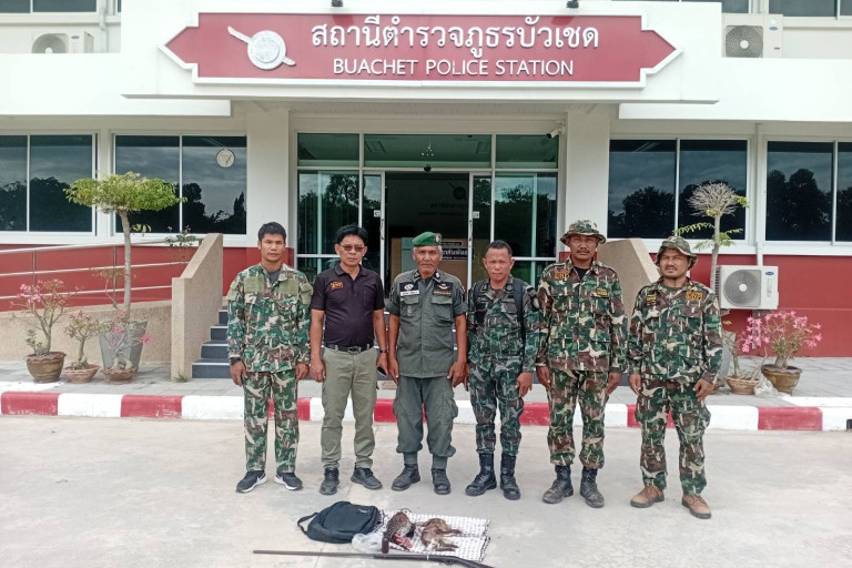 เจ้าหน้าที่ตำรวจ สนธิกำลังเข้าจับกุม ชาวบ้านลักลอบล่าสัตว์ ป่า ตามแนวอ่างเก็บน้ำใกล้ชายแดนไทย-กัมพูชา จับกุมชาวบ้าน 1ราย พร้อมอาวุธและสัตว์ป่าส่งดำเนินคดี