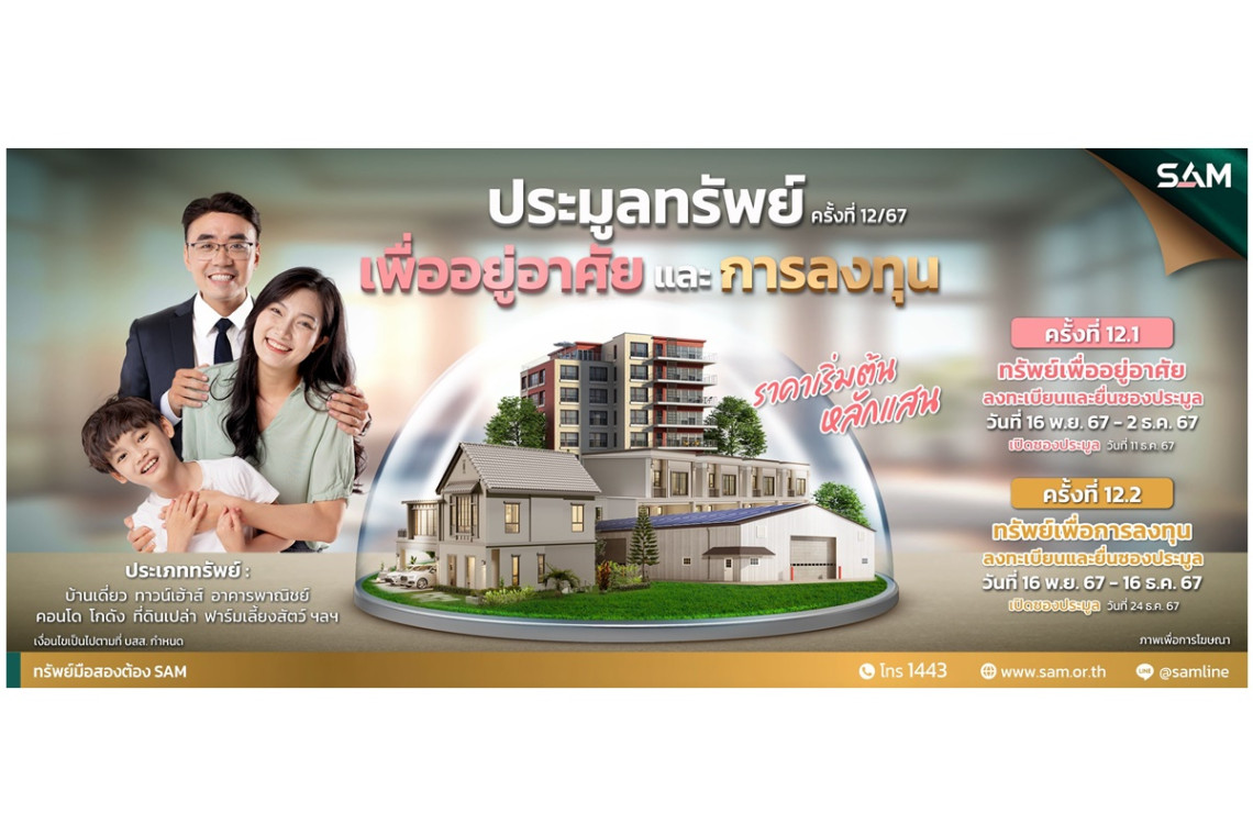 SAM ส่งท้ายปี 67 นำทรัพย์เด่นเพื่ออยู่อาศัยและลงทุนบนทำเลที่ดีทั่วประเทศ จำนวน 66 รายการ มูลค่า 288 ลบ. จัดประมูลครั้งสุดท้ายของปีนี้ 2 รอบ 11 ธ.ค.และ 24 ธ.ค.นี้