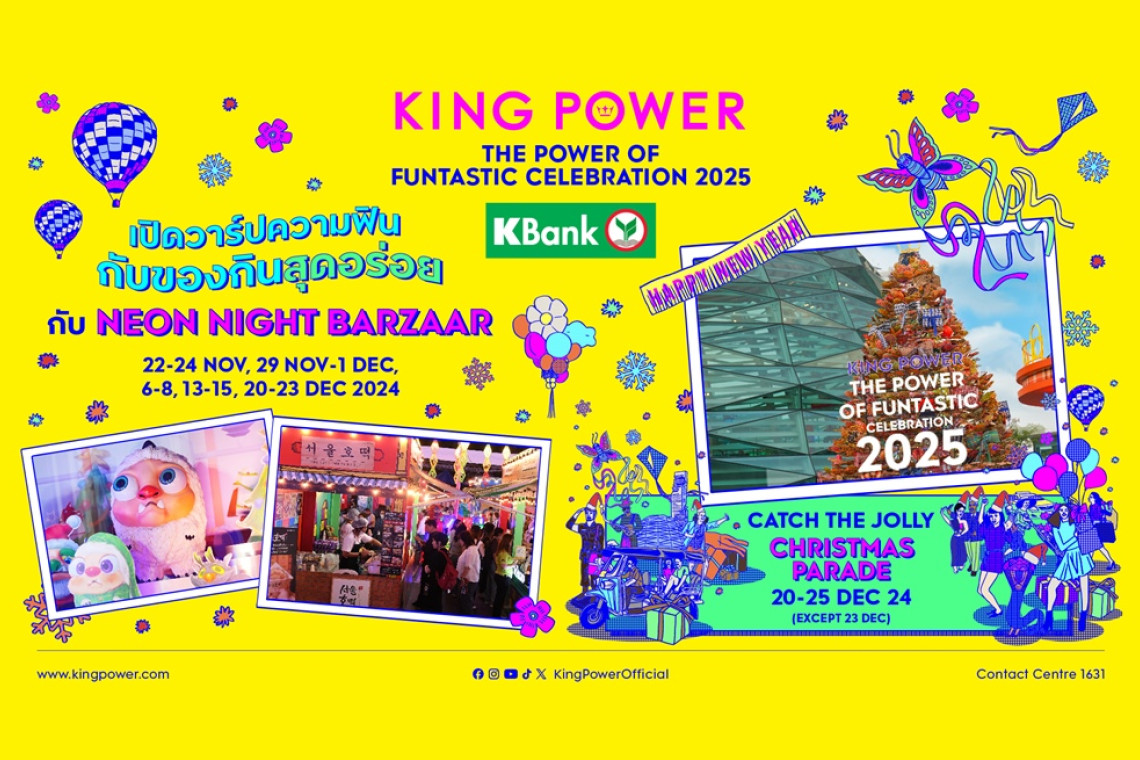 คิง เพาเวอร์ ร่วมกับธนาคารกสิกรไทย ชวนปักหมุดเที่ยวคริสต์มาสส่งท้ายปี กับแคมเปญ “THE POWER OF FUNTASTIC CELEBRATION 2025” ฉลองทุกความสุข สนุกไม่รู้จบ เป็นไปได้ เนรมิตงานเฉลิมฉลองความสุขของเทศกาลเฟสทีฟส่งท้ายปีในบรรยากาศคริสต์มาสสไตล์ไทย พบกับต้นคริสต์มาสที่สร้างสรรค์จากการใช้หัตถกรรมพื้นบ้านไทยอย่างพัดตอกสานและกระจาดไม้ไผ่ ภายใต้คอนเซปต์ RELOCAL CHRISTMAS TREE เพื่อสร้างรายได้กลับสู่ชุมชนแบบยั่งยืน พร้อมเปิดวาร์ปความฟินกับ NEON NIGHT BARZAAR คาราวานความอร่อยกว่า 30 ร้าน แบบจัดเต็ม และอัดแน่นกับคอนเสิร์ตจากเหล่าศิลปินชื่อดังที่ยกขบวนมาร่วมมอบความสุขสุดยิ่งใหญ่ วันนี้ถึง 31 ธันวาคม 2567 และพลาดไม่ได้กับเปิดวาร์ปชั่วโมงแห่งความสุขกับขบวนคริสต์มาสพาเหรดที่จะมาส่งความสุขและของขวัญพิเศษให้กับทุกท่าน ในวันที่ 20 - 22 และ 24 - 25 ธันวาคม 2567 ที่ คิง เพาเวอร์ รางน้ำ