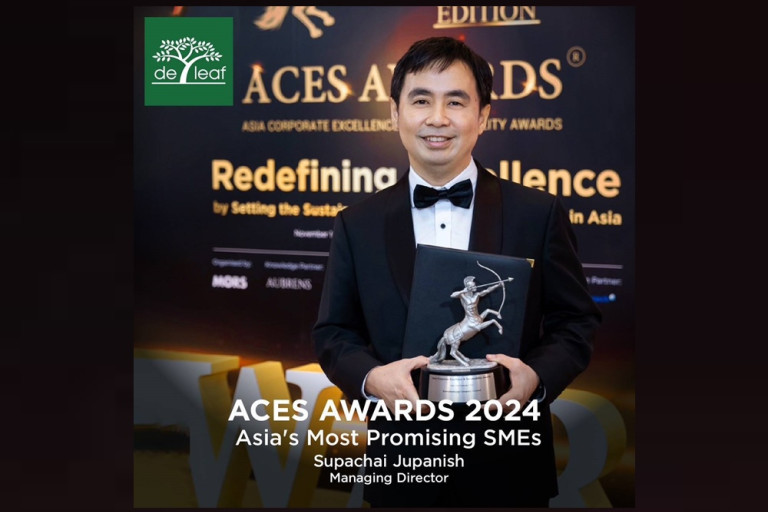 และล่าสุดคว้ารางวัล ‘Asia's Most Promising SMEs’ จาก Asia Corporate Excellence & Sustainability Awards (ACES AWARDS 2024) ซึ่งเป็นหนึ่งในสุดยอดรางวัลเกียรติยศที่มอบให้กับผู้นำองค์กร บริษัทและแบรนด์ชั้นนำต่างๆ ในเอเชีย เพื่อเป็นการถ่ายทอดเรื่องราวความสำเร็จรวมทั้งวิสัยทัศน์ผู้นำจากเอเชียสู่การรับรู้ในระดับโลก ตอกย้ำความสำเร็จและคุณภาพในผลิตภัณฑ์ทุกชิ้นจาก De Leaf