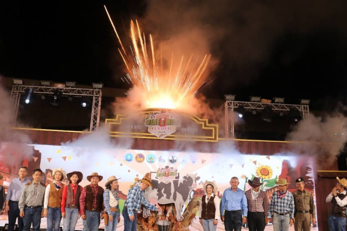 วันที่ 27 พ.ย. 2567 ที่ ณ ทุ่งทานตะวันปั๊มปตท. มวกเหล็ก อำเภอมวกเหล็ก จังหวัดสระบุรี นายบัญชา เชาวรินทร์ ผู้ว่าราชการจังหวัดสระบุรี เป็นประธานในพิธีเปิดงาน "MEAT & MILK FESTIVAL 2024" พร้อมด้วย น.ส.พัชรศรี สมบัติทวีพูน ท่องเที่ยวและกีฬาจังหวัดสระบุรี , นางสาวอ้อยทิพย์ ปานสะอาด นายอำเภอมวกเหล็ก และหัวหน้าส่วนราชการ ผู้บริหารหน่วยงานพันธมิตรทั้งภาครัฐและเอกชน ตลอดจนประชาชนชาวสระบุรีและนักท่องเที่ยวเข้าร่วมในพิธีเปิดสุดยิ่งใหญ่ตระการตาในธีมเมืองคาวบอยมวกเหล็ก จัดโดย จังหวัดสระบุรี , สำนักงานการท่องเที่ยวและกีฬาจังหวัดสระบุรี , อำเภอมวกเหล็ก และหน่วยงานพันธมิตร ซึ่งเป็นการจัดงานภายใต้โครงการจัดงานส่งเสริมการท่องเที่ยวเชิงอัตลักษณ์อำเภอมวกเหล็ก จังหวัดสระบุรี หรือ MEAT & MILK FESTIVALเพื่อกระตุ้นเศรษฐกิจและสร้างรายได้ให้แก่ชุมชนในพื้นที่อำเภอมวกเหล็กและจังหวัดสระบุรี สร้างภาพลักษณ์ที่ดีในการประชาสัมพันธ์แหล่งท่องเที่ยว และส่งเสริมกิจกรรมการท่องเที่ยวในรูปแบบใหม่ ให้ตรงกับความต้องการของนักท่องเที่ยว โดยนำอัตลักษณ์ของอำเภอมวกเหล็กที่เป็นแหล่งผลิตโคเนื้อและโคนมที่สำคัญของประเทศและความน่าสนใจในวิถีการเป็นเมืองคาวบอยของมวกเหล็กมาเป็นจุดขายดึงดูดนักท่องเที่ยวให้มาพักค้างคืนในพื้นที่เพิ่มมากขึ้น เกิดการใช้จ่ายในพื้นที่เพิ่มมากขึ้น