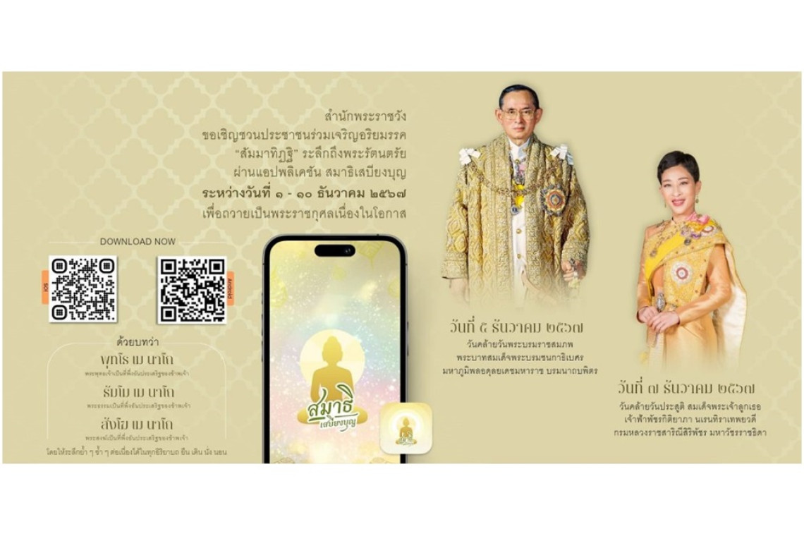 วันที่ 28 พ.ย.67 สำนักพระราชวัง ขอเชิญชวนประชาชนร่วมเจริญอริยมรรค “สัมมาทิฏฐิ” ระลึกถึงพระรัตนตรัย ว่าเป็นสรณะที่พึ่งที่ยึดถือ อันเป็นทางเป็นธรรมที่พระพุทธองค์ได้ตรัสไว้โดยชอบ เพื่อถวายเป็นพระราชกุศลเนื่องในโอกาสวันคล้ายวันพระบรมราชสมภพ พระบาทสมเด็จพระบรมชนกาธิเบศร มหาภูมิพลอดุลยเดชมหาราช บรมนาถบพิตร ในวันที่ 5 ธันวาคม 2567 และวันคล้ายวันประสูติ สมเด็จพระเจ้าลูกเธอ เจ้าฟ้าพัชรกิติยาภา นเรนทิราเทพยวดี กรมหลวงราชสาริณีสิริพัชร มหาวัชรราชธิดา ในวันที่ 7 ธันวาคม 2567 ผ่านแอปพลิเคชัน “สมาธิเสบียงบุญ” บันทึกเวลาการทำสมาธิเจริญจิตตภาวนา ตั้งแต่วันที่ 1 ธันวาคม 2567 เวลา 08.00 น. ถึง วันที่10 ธันวาคม 2567 เวลา 08.00 น. ทั้งนี้ สามารถ ดาวน์โหลดแอปพลิเคชันได้ทั้ง PLAY STORE และ APP STORE