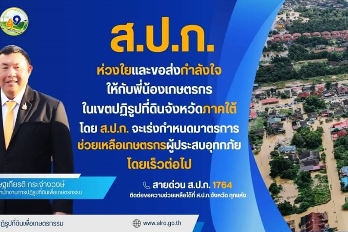 ล่าสุด นายเศรษฐเกียรติ กระจ่างวงษ์ เลขาธิการสำนักงานการปฏิรูปที่ดินเพื่อเกษตรกรรม (ส.ป.ก.) มอบหมายให้ นายประเสริฐ กองสง ปฏิรูปที่ดินจังหวัดนราธิวาส พร้อมด้วยเจ้าหน้าที่ ส.ป.ก.นราธิวาส ร่วมกันจัดหาน้ำดื่มพร้อมมอบเงินทุนจำนวนหนึ่งให้กับเกษตรกรบ้านพรุกาบแดง ต.ไพรวัน อ.ตากใบ จ.นราธิวาส เพื่อประกอบอาหาร และนำข้าวกล่องแจกจ่ายบรรเทาความเดือดร้อนผู้ประสบภัยน้ำท่วมภาคใต้