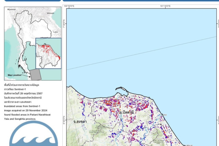 สำหรับการติดตามสถานการณ์น้ำท่วมขัง GISTDA ได้วางแผนและปรับแผนรับสัญญาณดาวเทียม เพื่อวิเคราะห์ ติดตามสถานการณ์ในพื้นที่ที่คาดว่าจะได้รับผลกระทบจากน้ำท่วมอย่างต่อเนื่อง โดยท่านสามารถตรวจสอบพื้นที่อื่น ๆ พร้อมรายงานสรุปพื้นที่น้ำท่วมแต่ละจังหวัด เพิ่มเติมได้ที่ https://disaster.gistda.or.th