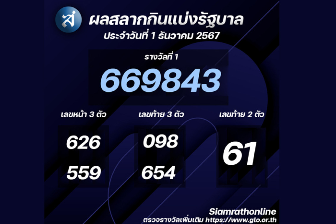 ผลสลากกินแบ่งรัฐบาลงวดประจำวันที่ 1 ธันวาคม2567