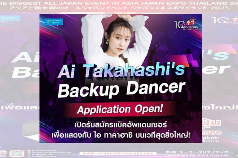 เพื่อเป็นการฉลองครบรอบ 10 ปี ของงาน JAPAN EXPO THAILAND 2025 เปิดโอกาสให้เหล่าแฟนคลับได้สมัครเป็นแบ็คอัพแดนเซอร์โชว์ลีลาการเต้นร่วมกับศิลปินไอดอลที่จะมาสร้างความสดใส Ai Takahashi (ไอ ทาคาฮาชิ) อดีตสมาชิกค่าย Hello! Project งานนี้สายแดนซ์ห้ามพลาด แล้วมาสร้างความทรงจำสุดแสนประทับใจบนเวทีของงานมหกรรมญี่ปุ่นที่ยิ่งใหญ่ที่สุดในเอเชีย ครั้งที่ 10 ไปด้วยกัน