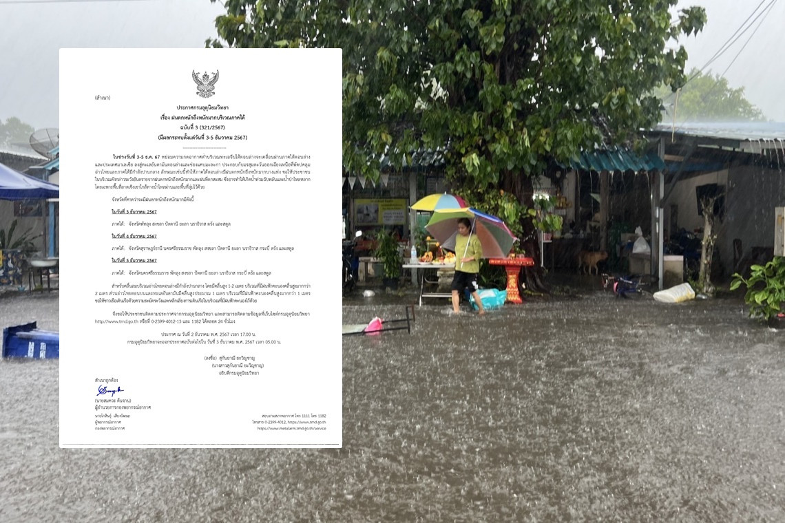 เมื่อเวลา 17.00 น.วันที่ 2 ธันวาคม 2567 กรมอุตุนิยมวิทยา ประกาศเรื่อง ฝนตกหนักถึงหนักมากบริเวณภาคใต้ ฉบับที่ 3 (321/2567) (มีผลกระทบตั้งแต่วันที่ 3-5 ธันวาคม 2567) ระบุว่า ในช่วงวันที่ 3-5 ธ.ค.67 หย่อมความกดอากาศต่ำบริเวณทะเลจีนใต้ตอนล่างจะเคลื่อนผ่านภาคใต้ตอนล่างและประเทศมาเลเซีย ลงสู่ทะเลอันดามันตอนล่างและช่องแคบมะละกา ประกอบกับมรสุมตะวันออกเฉียงเหนือที่พัดปกคลุมอ่าวไทยและภาคใต้มีกำลังปานกลาง ลักษณะเช่นนี้ทำให้ภาคใต้ตอนล่างมีฝนตกหนักถึงหนักมากบางแห่ง ขอให้ประชาชนในบริเวณดังกล่าวระวังอันตรายจากฝนตกหนักถึงหนักมากและฝนที่ตกสะสม ซึ่งอาจทำให้เกิดน้ำท่วมฉับพลันและน้ำป่าไหลหลาก โดยเฉพาะพื้นที่ลาดเชิงเขาใกล้ทางน้ำไหลผ่านและพื้นที่ลุ่มไว้ด้วย
