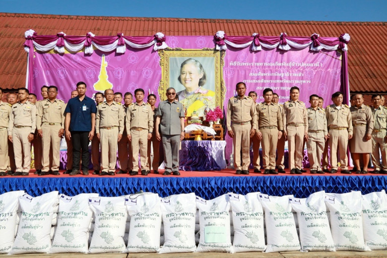 สมเด็จพระกนิษฐาธิราชเจ้า กรมสมเด็จพระเทพรัตนราชสุดาฯ สยามบรมราชกุมารี พระราชทานเมล็ดพันธุ์ข้าวปทุมธานี 1 ของมูลนิธิชัยพัฒนา แก่เกษตรกรผู้ประสบปัญหาภัยแล้งที่อำเภอเชียงแสน จังหวัดเชียงราย
