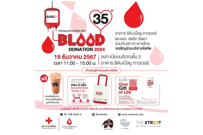 อาคาร ซีดับเบิ้ลยู ทาวเวอร์ ร่วมกับ ศูนย์การค้า เดอะ สตรีท รัชดา และสภากาชาดไทย ชวนผู้สนใจทุกท่านบริจาคโลหิตส่งท้ายปี เพื่อส่งมอบให้กับผู้ป่วยในโครงการ “Blood Donation 2024” ในวันที่ 19 ธันวาคม 2567 นี้ ระหว่างเวลา 11.00-15.00 น. ณ อาคาร ซีดับเบิ้ลยู ทาวเวอร์