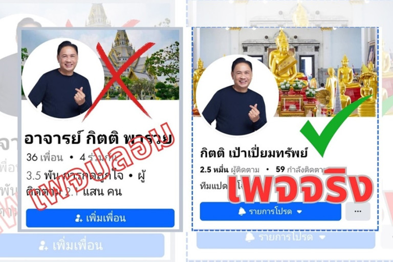 โดยมีการทำเครื่องหมายกากบาทสีแดงที่ด้านบนภาพหน้าเพจปลอม และทำเครื่องหมายถูกสีเขียวที่ภาพหน้าปกเพจจริง และยังมีความแตกต่างกันที่จำนวนผู้ติดตามบนเพจจริงที่จำนวน 2.5 หมื่น และอีก 59 กำลังติดตาม ส่วนเพจปลอมนั้น หน้าเพจแสดงจำนวนเพื่อน 36 คน 4 ผู้อยู่ร่วมกันและมีการกดถูกใจ 3.5 พันคน ซึ่งข้อความที่ถูกโพสต์ในเพจปลอม ที่ใช้ชื่อผู้โพสต์ว่า “อาจารย์ กิตติ พารวย วันนี้วันเกิด อาจารย์ ครับ แค่ส่งสติ๊กเกอร์ Happy dirthbay คนละ 1 ดว รับไป 10,000 บาท พร้อมโอนครับ เอาไปทำทุนครับ”