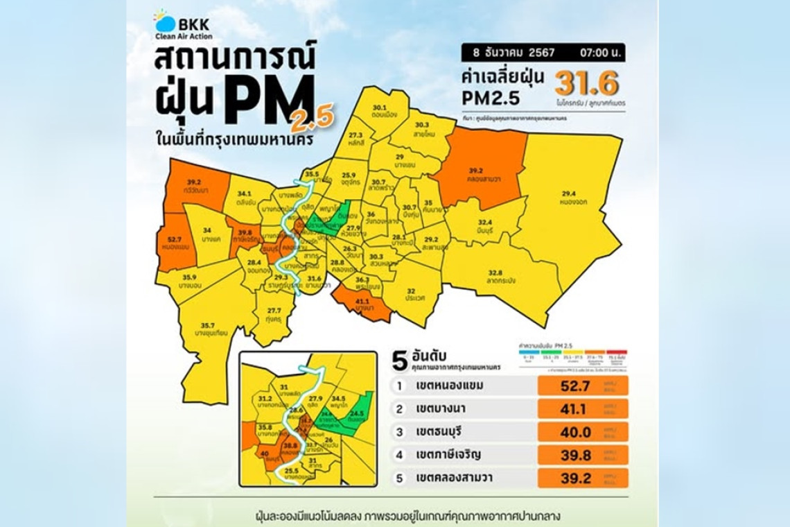 เมื่อวันที่ 8 ธ.ค.67 ศูนย์ข้อมูลคุณภาพอากาศกรุงเทพมหานครขอสรุปผลการตรวจวัด PM2.5 ประจำวันอาทิตย์ที่ 8 ธันวาคม 2567 เวลา 05.00-07.00 น.ตรวจวัดได้ 23.1-54.3 มคก./ลบ.ม. ค่าเฉลี่ยของกรุงเทพมหานคร 31.6 มคก./ลบ.ม. ค่า PM2.5 มีแนวโน้มลดลง เกินมาตรฐานอยู่ในระดับสีส้ม และเริ่มมีผลกระทบต่อสุขภาพ จำนวน 12 พื้นที่
