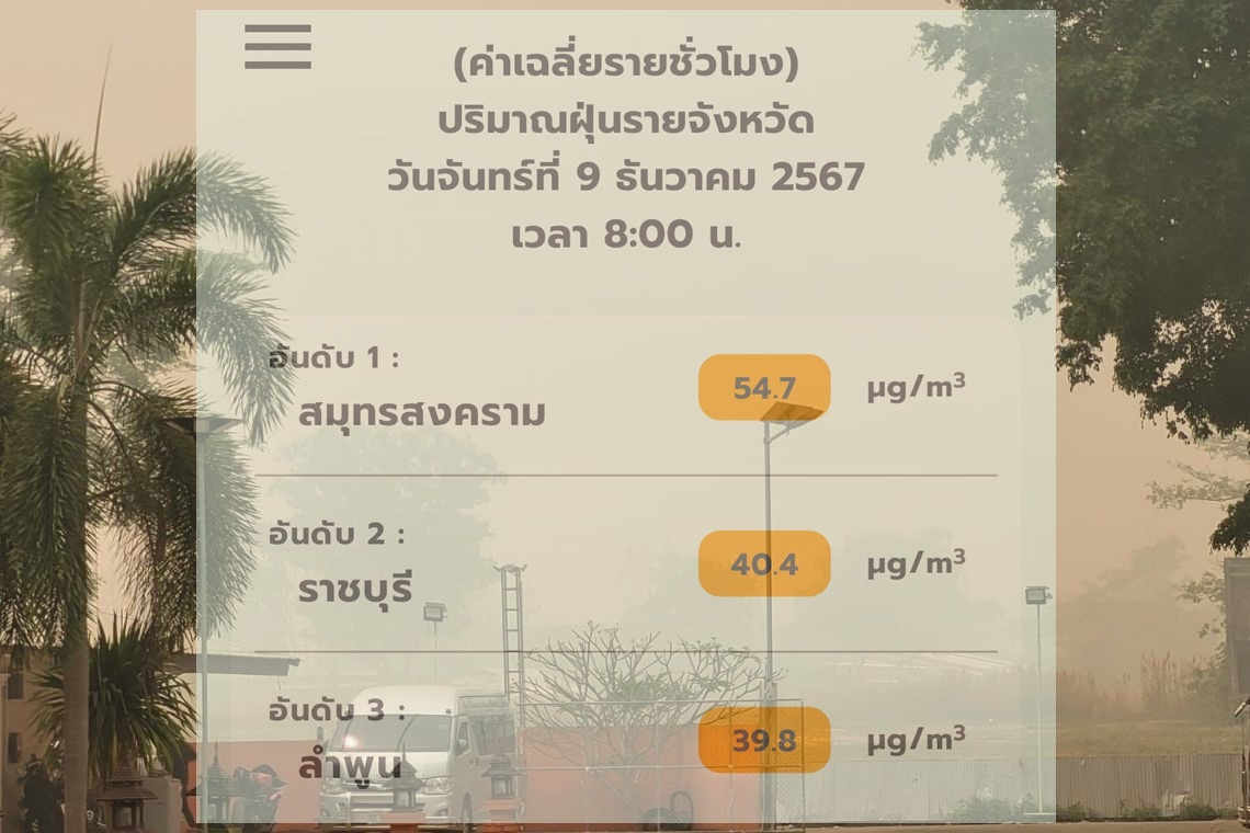 วันที่ 9 ธ.ค.67 GISTDA เกาะติดสถานการณ์ฝุ่น PM 2.5 ด้วยข้อมูลจากดาวเทียมรายชั่วโมงผ่านแอปพลิเคชั่น “เช็คฝุ่น” (เวลา 8.00 ของวันที่ 9 ธันวาคม 2567) พบค่าคุณภาพอากาศเกินเกณฑ์มาตรฐานและเริ่มมีผลกระทบต่อสุขภาพและระบบทางเดินหายใจ(สีส้ม) ในจังหวัด คือ #สมุทรสงคราม 54.7 ไมโครกรัม #ราชบุรี 40.4 ไมโครกรัม #ลำพูน 39.8 ไมโครกรัม ในส่วนของจังหวัดอื่นๆ พบค่าคุณภาพอากาศปานกลางไปจนถึงดีมาก
