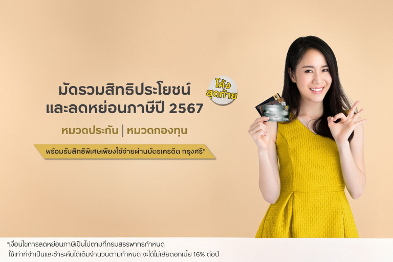 บัตรเครดิต กรุงศรี ชวนวางแผนลดหย่อนภาษีรับปลายปี มอบสิทธิพิเศษสุดคุ้ม เมื่อชำระค่าเบี้ยประกันผ่านบัตรเครดิต รับเครดิตเงินคืนรวมสูงสุด 28,000 บาท (ตามประเภทบัตรที่ร่วมรายการ) เมื่อใช้จ่ายผ่านบัตรในหมวดประกันตามเงื่อนไข พร้อมรับเครดิตเงินคืนเพิ่ม 15% เมื่อมียอดชำระเบี้ยประกันและแลกพอยต์ตามที่กำหนด พิเศษ เบี้ยประกันแบ่งชำระได้ ดอกเบี้ย 0% นาน 3 เดือน เมื่อใช้จ่ายตามเงื่อนไข ทำรายการง่ายๆผ่านเมนู U PLAN บนแอปพลิเคชัน UCHOOSE หรือสามารถเลือกซื้อกองทุนประหยัดภาษีด้วยบัตรเครดิต กรุงศรี ผ่านช่องทางออนไลน์ สะดวก ง่าย ผ่าน Selling agent ครอบคลุมกองทุนจาก บลจ. ชั้นนำ ตั้งแต่ 1 ต.ค.2567-30 ธ.ค.2567 (เงื่อนไขและระยะเวลาของแต่ละโปรโมชันเป็นไปตามที่บริษัทฯ กำหนด) กรุณาตรวจสอบข้อมูลเพิ่มเติมจาก www.krungsricard.com/th/Promotion/tax-deduction (ควรทำความเข้าใจลักษณะสินค้า เงื่อนไขผลตอบแทน ความเสี่ยง และศึกษาสิทธิประโยชน์ทางภาษีในคู่มือการลงทุนก่อนตัดสินใจลงทุน) บัตรเครดิตใช้เท่าที่จำเป็นและชำระคืนได้เต็มจำนวนตามกำหนด จะได้ไม่เสียดอกเบี้ย 16% ต่อปี