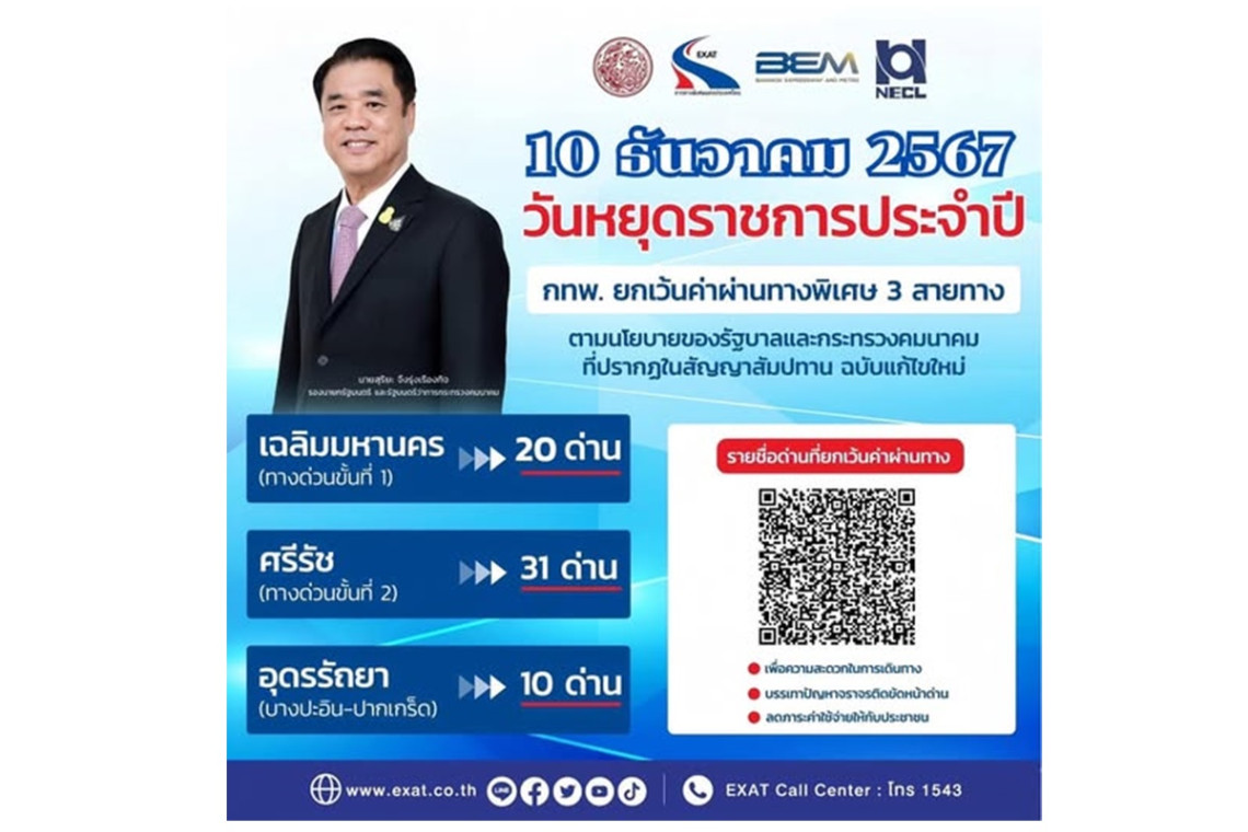 "วันรัฐธรรมนูญ" 10 ธ.ค.67 "การทางพิเศษฯ" ประกาศยกเว้นค่าผ่านทางพิเศษ 3 สายทาง รวม 61 ด่าน ชี้ช่วยอำนวยความสะดวก-ลดภาระค่าใช้จ่ายในการเดินทางให้กับพี่น้องประชาชน