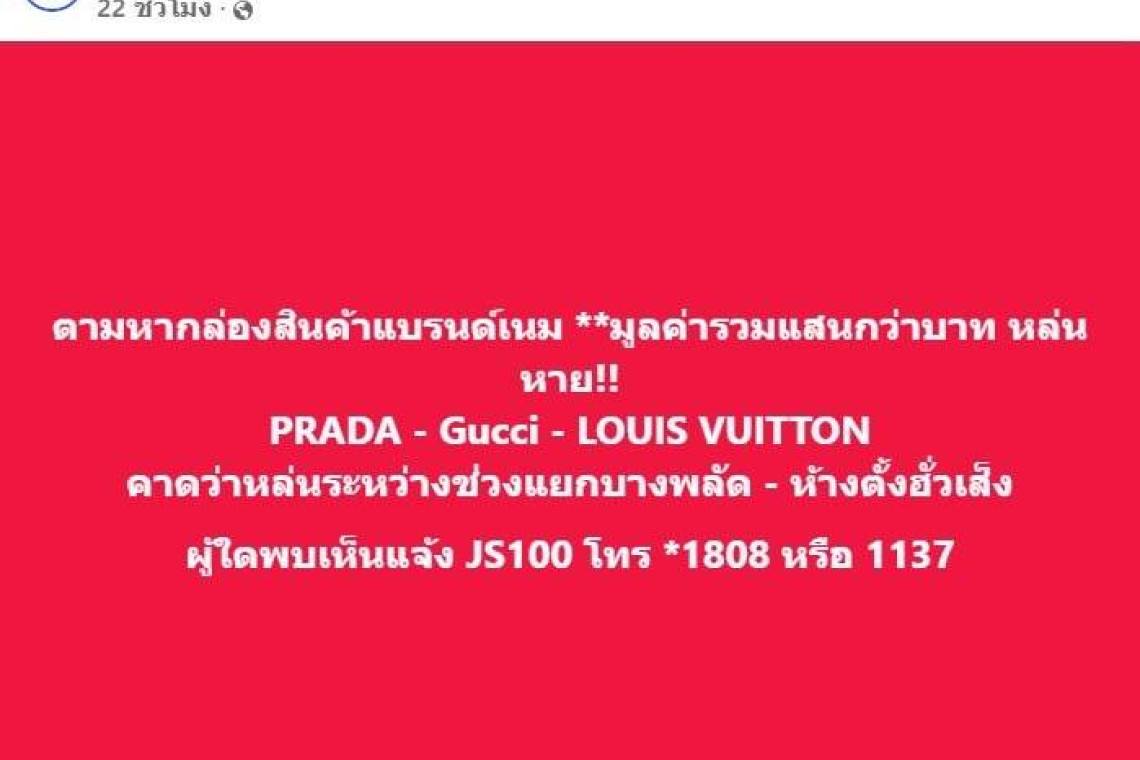 “เมื่อวันที่ 7 ธ.ค.67 คุณโยธิน(ขับไรเดอร์) แจ้งทำกล่องสินค้าของลูกค้าหล่นหายระหว่างทาง ภายในมีสินค้าแบรนด์เนม จำนวน 4 ชิ้น PRADA 2 กล่องGucci 1 กล่อง และเสื้อแจ็คเก็ตยีนส์ LOUIS VUITTON 1 ตัว ***มูลค่ารวมแสนกว่าบาทใช้เส้นทางจากศูนย์วัฒนธรรม > รัชดาภิเษก > เดอะสตรีท > ประชานุกูล >ซอยชื่นประชา > สะพานพระราม 7 > ตั้งฮั่วเส็ง > ตลิ่งชัน > ราชพฤกษ์ >กัลปพฤกษ์ > กำนันแม้น