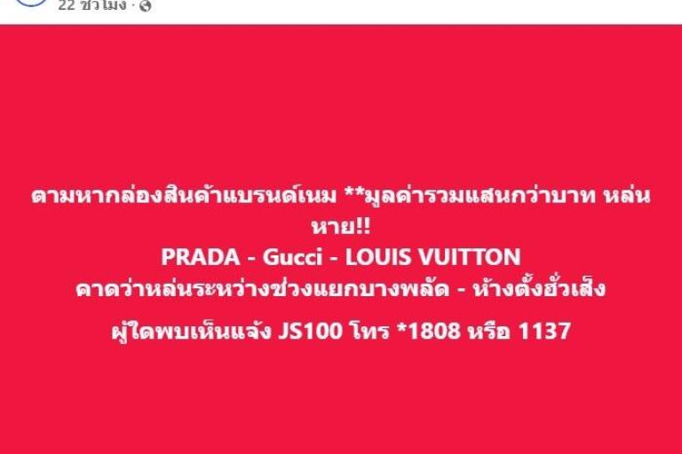 จากกรณี เพจ JS100 Radio ได้มีการประกาศ ตามหากล่องสินค้าแบรนด์เนม ที่ไรเดอร์ คนหนึ่งได้ทำหล่นหาย โดยมีมูลค่า นับแสนบาท โดยมีการโพสต์ว่า ตามหากล่องสินค้าแรนด์เนม **มูลค่ารวมแสนกว่าบาท หล่นหาย!! PRADA - Gucci - LOUIS VUITTON คาดว่าหล่นระหว่างช่วงแยกบางพลัด – ห้างตั้งฮั่วเส็ง ผู้ใดพบเห็นแจ้ง JS100 โทร *1808 หรือ 1137 นอกจากนี้ ยังมีข้อมูลรายละเอียด ในจุดที่คาดหล่นหาย ไว้ใต้โพสต์และคลิปกล้องวงจรปิดบางส่วน ที่แยกบางพลัดจับภาพไว้ได้